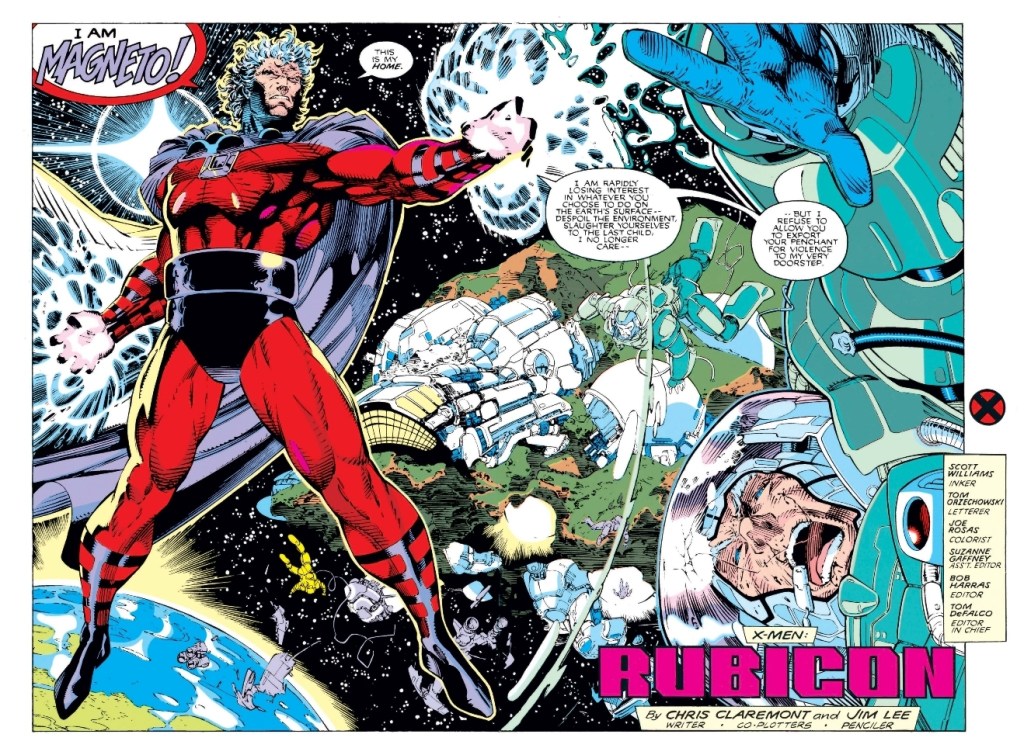 Magneto has been telling you humans since 1991, stay out my house!! Outside his base of Asteroid M in 1991’s X-Men #1, this epic first spread drawn by Jim Lee shows Magneto is having none of it from these rubes.
