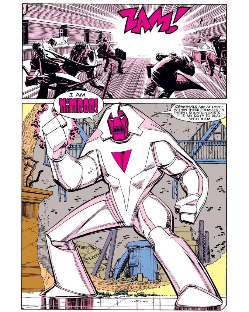 Nimrod’s first fight with the X-Men was in 1985’s Uncanny X-Men #194, taking them on in a bank. The adaptive machine was nearly impossible for the team, but Rogue was able to subdue him by taking the powers of Shadowcat, Colossus and Nightcrawler, effectively becoming the first chimera!