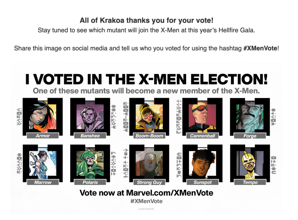 Make an informed #XMenVote! Before we could vote for the last addition to the new X-Men team, Justin had to explain to Alicia what @Marvel was doing and who her options were – with some slight campaigning…